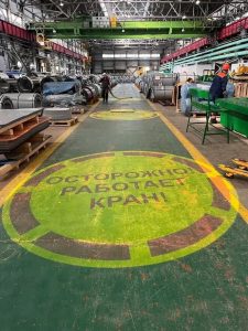 Параллельно с «техническим зрением» в заводских цехах внедряется еще одно новшество. По инициативе управления охраны труда и охраны окружающей среды на краны будут устанавливаться гобо-проекторы – системы световой демаркации опасных зон. Это проекторы, которые крепятся на кран и проецируют на пол предупреждающие знаки: «Опасная зона», «СТОП», «Работает кран». Идея в том, чтобы человек, оказавшийся рядом с работающим краном, видел границы опасной зоны.